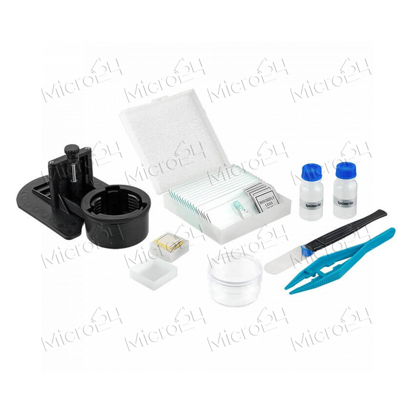 Лабораторное оборудование для проведения опытов. Конструкция прибора имеет перевернутую оптику: три увеличительных объектива расположены под предметным столиком, а осветитель – сверху. На столике предусмотрены клеммы с пружинным механизмом, которые дают возможность зафиксировать объекты исследования на стекле. Микроскоп позволяет наблюдать за микроорганизмами, которые выращиваются в специальной посуде. Питается устройство от 3 батареек формата АА. В комплектацию входят набор из 15 образцов, чистые наклейки, скальпель, готовые реактивы, покровные стекла, пинцет, мензурка.